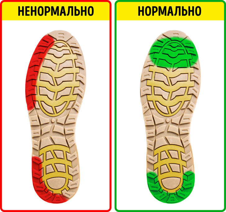 Підошва взуття не може служити вічно, і вона в будь-якому випадку буде стиратися. Але важливо те, в яких саме місцях це відбувається. Підошва взуття здорової людини буде протиратися на носку і п'яті, а ось сліди від потертостей тільки на лівій стороні можуть бути ознакою поздовжнього плоскостопості.