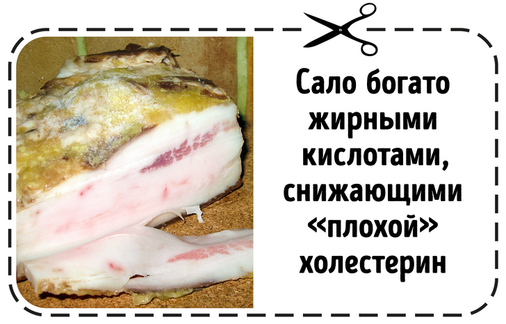 Згідно з дослідженнями, 60 % від загальної кількості жирів в салі складають мононенасичені жирні кислоти, значна частка яких припадає на олеїнову кислоту (омега-9). Вона сприяє зниженню кількості «поганого» холестерину в організмі. А ось в популярному сьогодні суперфуде — кокосовому маслі — мононенасичених кислот в 10 разів менше.