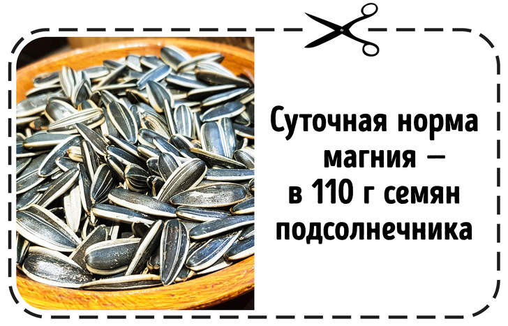 У 100 г соняшникового насіння міститься практично 100 % денної дози магнію — елемента, який називають найважливішим для серця. Є в них і цинк, який грає одну з головних ролей в регуляції роботи серцевого м'яза: у тих же 100 г міститься половина рекомендованої добової норми.