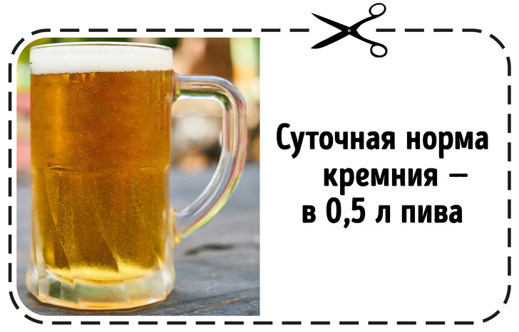 Пиво — один з головних джерел кремнію. В різні сорти цього напою може міститися від 6,4 до 56,5 мг на 1 л при щоденній нормі в 20-30 мг. Саме кремній відповідає за доставку кальцію в кістки і збереження щільності кісткової тканини. Кремній допомагає знизити ризик розвитку атеросклерозу — захворювання, що вражає судини і стає причиною інфаркту.