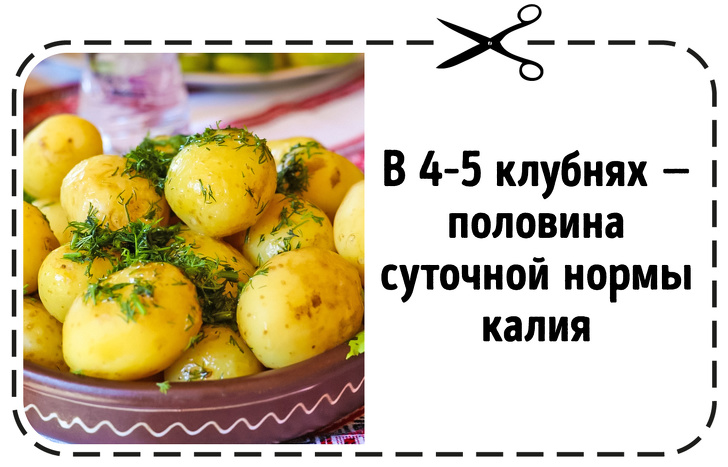 Картоплю часто виключають зі свого раціону ті, хто дотримується дієти. І це правильно, якщо мова йде про смаженої картоплі або чіпси. Однак у 100 г відвареної картоплі всього 82 ккал і маса калію, який необхідний для серця і допомагає регулювати кров'яний тиск. Крім того, в тій же кількості картоплі міститься до 12-15 % добової норми вітаміну B6, який бере участь в утворенні червоних кров'яних тілець.