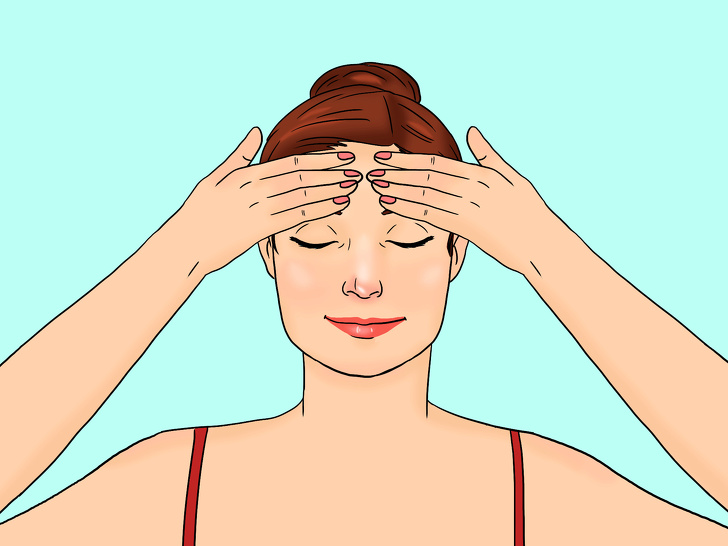 Руки в кулак. Ставимо фаланги пальців трохи вище лінії брів і проводимо вгору до волосся. Тепер зміщуємо руки трохи в сторони і знову піднялися вгору. Таким чином розгладжуємо всю поверхню чола.