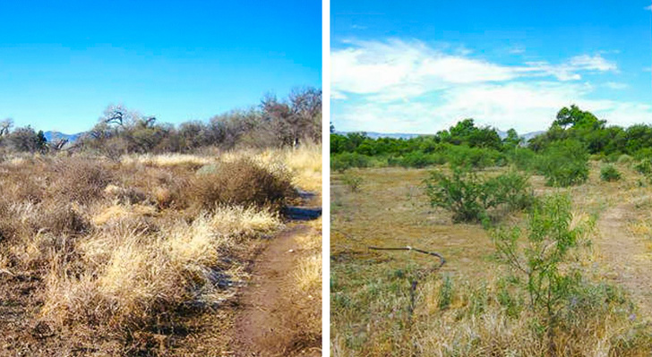 Це штат Арізона, США. З 1947 до 1990 року на цій землі розводили худобу. І тільки в 2013 році (як виглядала в цей час земля, видно на фотографії зліва) місцеві активісти цілеспрямовано зайнялися відновленням грунту. І вже в 2014 році (малюнок праворуч) були помітні поліпшення.