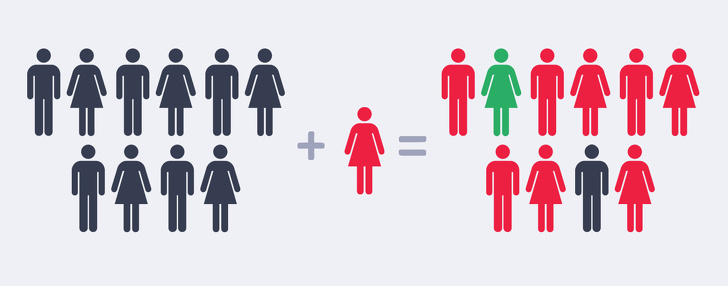 Ось так буде виглядати зустріч здорових людей та однієї людини, який заражений кір. Згідно зі статистичними даними, дев'ять з 10 людей захворіють, а один з них ще й отримає ускладнення.