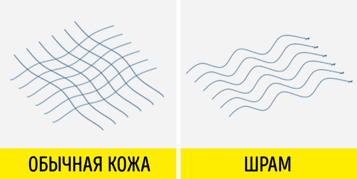 - Шрами відрізняються від шкіри тому, що волокна колагену в них розташовуються не хрест-навхрест, як у звичайної тканини шкіри, а паралельно один одному.