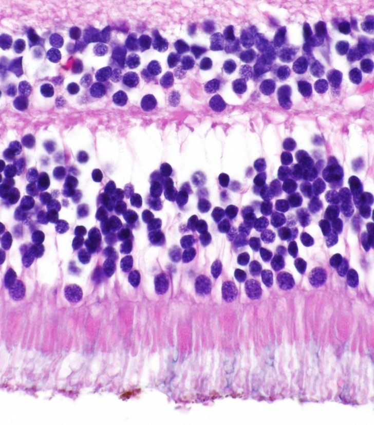 Сітківка ока при багаторазовому збільшенні. У самому низу можна побачити палички і колбочки