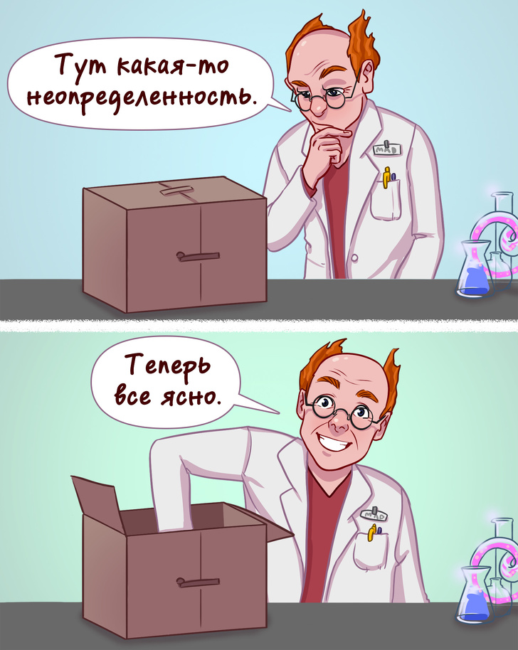 Якщо до кінця нашої статті ваші мізки починають кипіти, ось вам пояснення Шелдона Купера з серіалу «Теорія Великого вибуху». Головний ботан серіалу застосував теорію до відносин між людьми. Щоб зрозуміти, які відносини між чоловіком і жінкою, потрібно відкрити залізний ящик (піти на побачення). Поки ящик закритий, відносини і хороші, і погані одночасно.