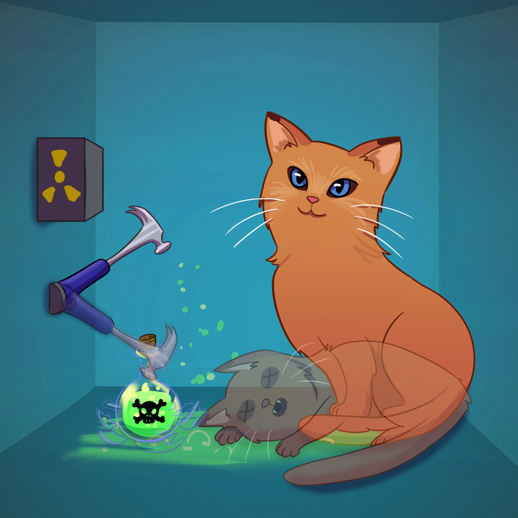 - Якщо ядро розпадеться, котику не пощастить. Тому що розпад ядра буде зафіксований лічильником Гейгера, спрацює реле, і спеціальний молоточок розіб'є ампулу з токсичним газом. Кіт мертвий.