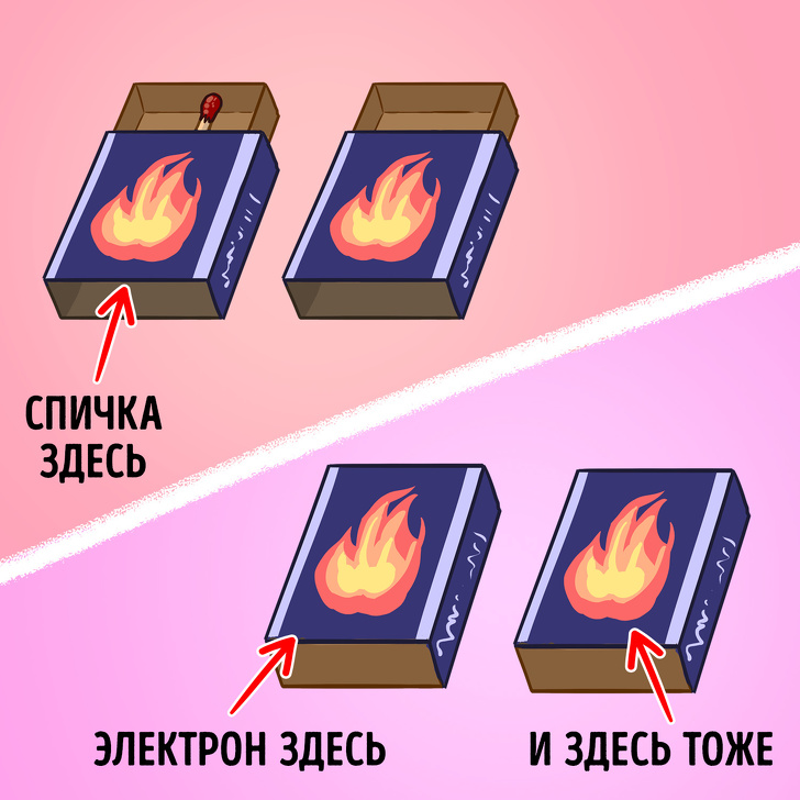 Все змінюється, якщо замість сірники взяти електрон: він буде перебувати одночасно в 2 коробках. Так працюють закони квантової фізики.