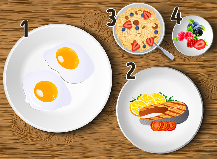 - Сніданок: омлет з білків 3 яєць і 1 цілого яйця і (або) 110-160 м лосося (рибу можна замінити на м'ясо птиці або тофу); півсклянки вівсяної каші, півчашки ягід і часточка дині; 1-2 склянки води.