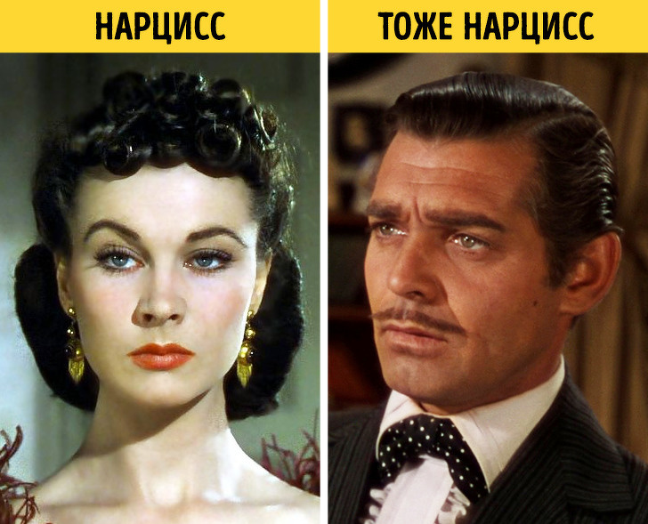 Союз Ретта і Скарлетт здається ідеальним: вони обидва яскраві, сильні і вміють викручуватися з будь-яких обставин. Але якщо придивитися, відносини цієї пари схожі на катастрофу. Деякі фахівці навіть вважають героїв нарцисами, оскільки вони не шкодують почуттів інших людей. Заради своїх цілей Скарлетт не щадить ні родичів, ні прислугу, ні шанувальників. До тих пір, поки не зустрічає Ешлі Уїлкса, якому ця гра абсолютно не цікава. Зіткнувшись з відмовою, героїня вирішує, що Ешлі — кохання всього її життя, починає страждати і прикладати всі зусилля для того, щоб домогтися бажаного. А все тому, що нарциси категорично не переносять відмов.