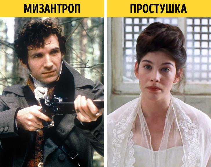 Євген — похмурий мізантроп і нарцис, який любив тільки себе. Наївна, проста Тетяна майже миттєво відкривається коханому і відкрито заявляє про свої почуття, однак Онєгіна найбільше привернули ореол, створений після заміжжя героїні у вищому світі, і її байдужість в кінці роману. Якщо б вона залишилася колишньою, можна з упевненістю сказати, що він би пройшов повз.