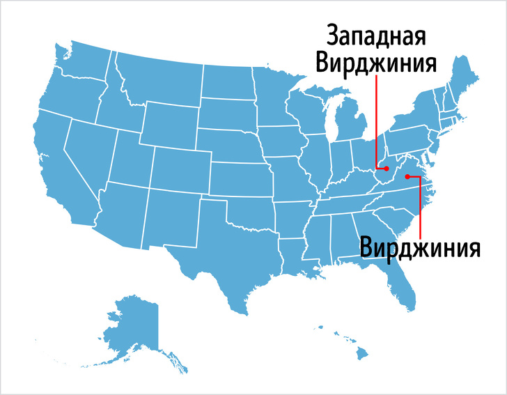 Географічно частина американського штату Вірджинія знаходиться західніше, ніж весь штат Західна Вірджинія.