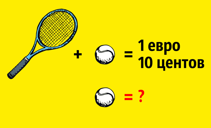 1. Тенісні ракетка і м'яч разом коштують 1 євро і 10 центів. Тенісна ракетка на 1 євро дорожче м'яча. Скільки коштує м'яч?