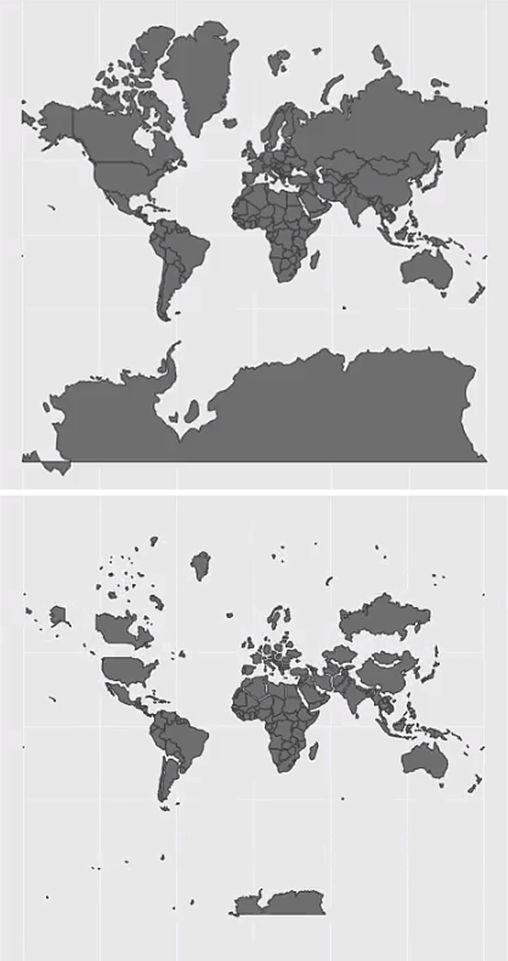 Звична всім карта світу і реальні розміри країн у зменшеному масштабі в співвідношенні один з одним