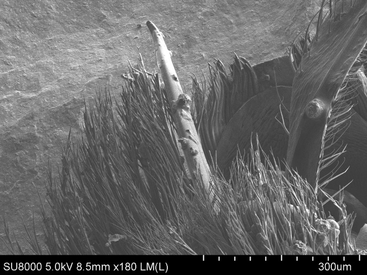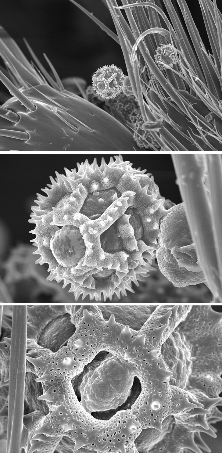 Пилок на бджолі під потужним електронним мікроскопом