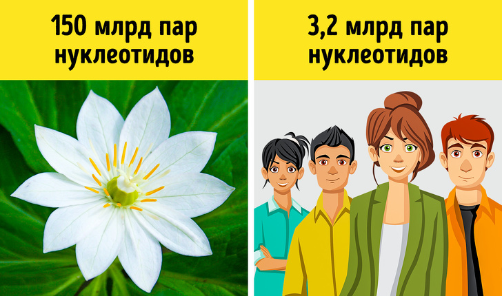Рослина вороняче око, батьківщиною якого є Японія, має в 50 разів більше пар нуклеотидів («букв», якими «написана» ДНК), ніж людина: 150 млрд проти 3,2 млрд. якби всі молекули ДНК, що містяться в одній клітині рослини, вишикувалися у висоту, вийшла б вежа розміром з Біг-Бен.