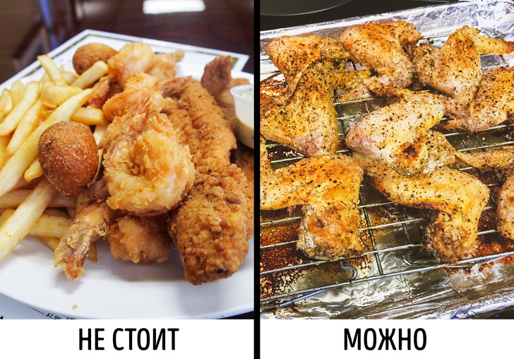 Багатьом знайоме відчуття, коли, поївши смаженого, хочеться трохи полежати з-за з'явилася тяжкості. Це все трапляється саме з-за високого вмісту жиру в такій їжі. Тому краще не варто вибирати таку їжу, щоб під час тренування не стикатися з уповільненим травленням. Перевагу краще віддати тушкованих, запечених, вареним продуктів.