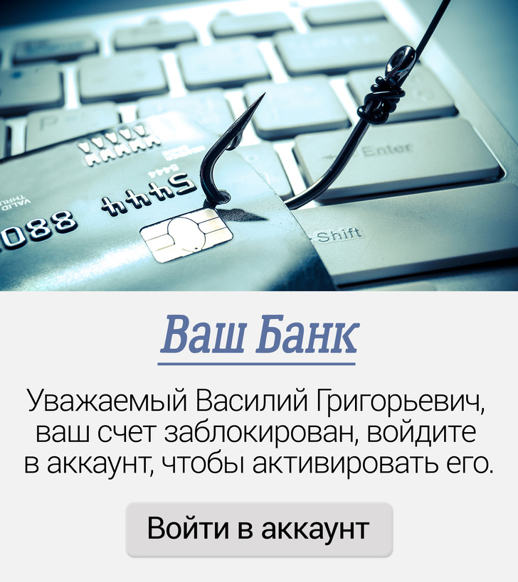 Що робити. Щорічно від даного виду шахрайства страждають мільйони людей, і убезпечитися від фішерів можна, лише ігноруючи ці посилання. Просто наберіть в рядку браузера адресу банку або сервісу, який нібито пише вам, і ви виявите, що з вашим акаунтом все в порядку. Банки і великі організації ніколи не закликають поширювати в інтернеті конфіденційну інформацію. Для цього вони попросять вас з'явитися особисто.