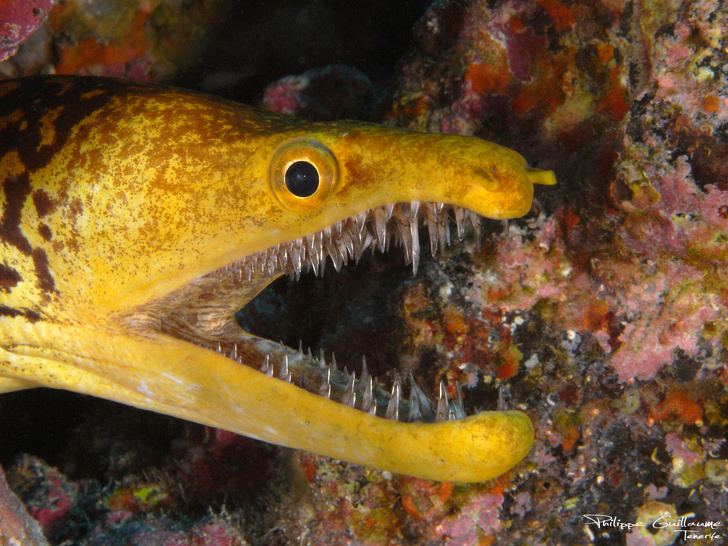Всі мурени — безжальні хижаки, ось і шаблезуба мурена не змогла піти проти своєї природи. Ще б: її пащу забезпечена двома рядами гострих і прозорих, наче скло, зубів. Мурени живуть у вузьких норах, тому широко розкрити рот і схопити здобич не можуть, але вони знайшли елегантний вихід: щелепа висувається хижачок. Дуже нагадує фільм «Чужий», правда?