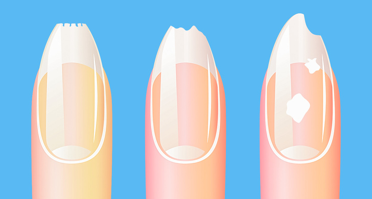 Всі ми знаємо, як виглядають здорові нігті. Будь-яка зміна в їх кольорі і структурі є тривожним сигналом. Тонкі бліді нігті можуть бути ознакою анемії і нестачі заліза в організмі; пожовтіння вказує на негаразди з печінкою і шлунковим трактом або сигналізує про ураження грибком; білі плями і смуги — брак цинку, міді і йоду; надмірна ламкість проявляється через брак вітамінів, кальцію, заліза і бета-каротину.