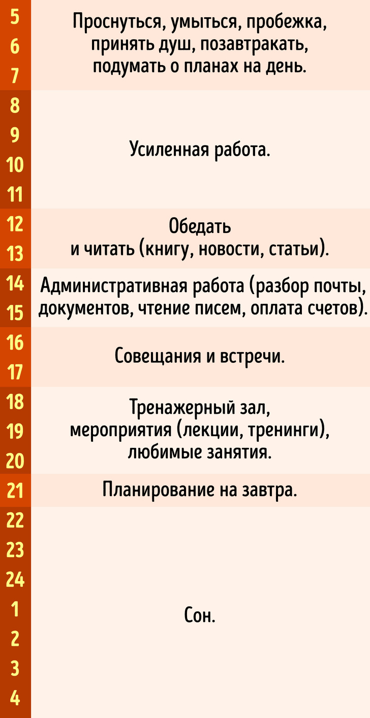 Перші години після пробудження повинні бути присвячені найважливішим завданням, тому що в цей час мозок справляється з ними краще і швидше. Крім того, зробивши саму складну роботу спочатку, ви не будете думати про неї весь день.
