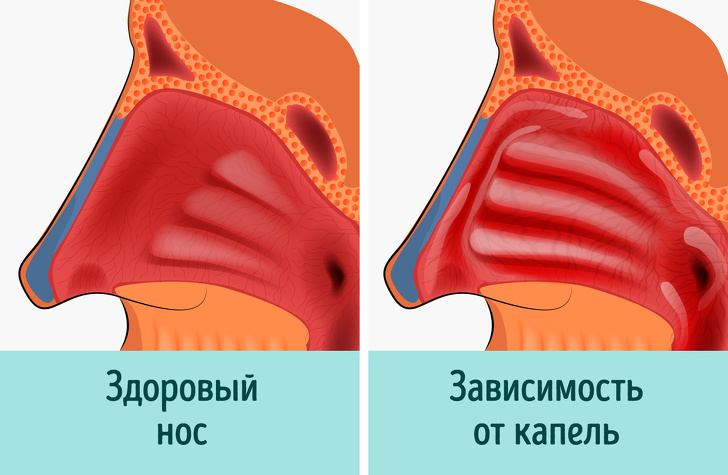Судинозвужувальні спреї і краплі начебто ксилометазоліну і нафтизину придумали зовсім не для того, щоб ми жили на них роками. Це протинабрякові симптоматичні засоби, які рекомендують використовувати строго по інструкції: не більше 5-7 днів і бажано 1-2 рази на добу (наприклад, перед сном). При зловживанні дуже легко отримати вазомоторний риніт — справжню залежність, коли ніс вже не здатний дихати без них, і вирішувати цю проблему доведеться, швидше за все, хірургічно. Ще один більш рідкісний, але не менш неприємний варіант — озена (атрофічний риніт) з «бонусами» у вигляді хронічного запалення і втрати нюху.