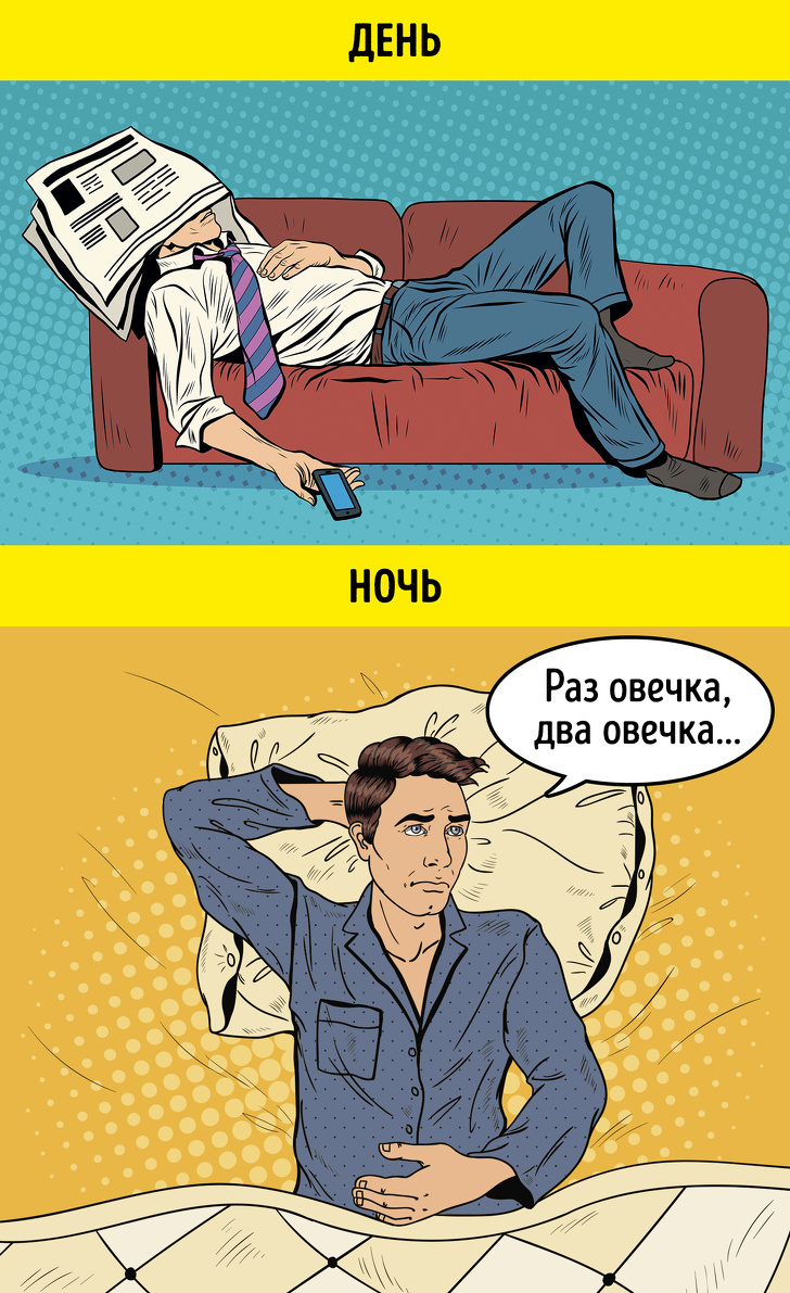 Організм дорослої людини не потребує окремого денному сні, але при цьому така ж людина нерідко засинає в кріслі перед телевізором, в автобусі або на пасажирському сидінні автомобіля. Якщо ви дрімаєте уривками протягом дня, то якість нічного сну може погіршитися. З порушенням режиму і неурочным сном пов'язана і так звана безсоння вихідного дня, коли людина не може заснути в неділю, а в понеділок вранці відчуває себе розбитим.