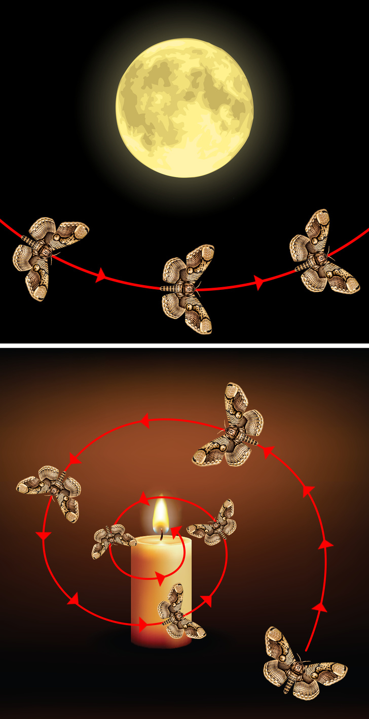 Нічні комахи орієнтуються по Місяцю. Випромінювання далекого джерела світла (Місяця) сприймається метеликом як паралельне поверхні Землі. Якщо метелик бере його за орієнтир, він зможе рухатися по прямій, постійно витримуючи певний кут між своєю траєкторією і траєкторією місячного світла. Випромінювання близького джерела світла (свічки або лампи) не паралельне, а радіальне — світло поширюється у всіх напрямках від джерела. Метелик цього не розуміє, і тому, продовжуючи витримувати постійний кут, рухається по колу або спіралі.