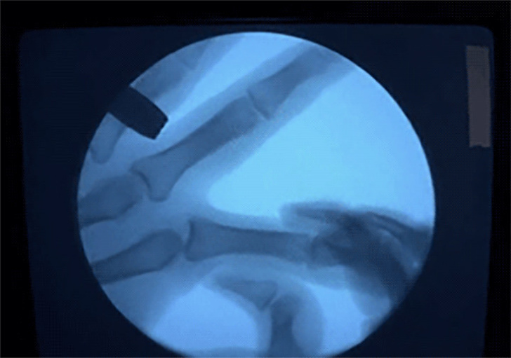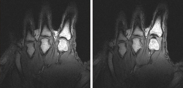 Темна пляма між суглобами праворуч — порожнеча, яка утворюється під час хрускоту.