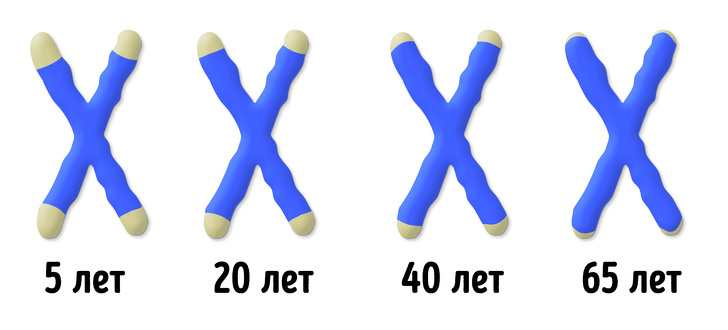 Теломери — це ділянки хромосом, які відповідають за кількість поділів клітини до її знищення. Хоча довжина теломер у кожної людини індивідуальна, народжується людина з довжиною теломер 15-20 тис. пар нуклеотидів, а вмирає з довжиною 5-7 тис. Довжина їх поступово зменшується за рахунок процесу, званого межею Хейфлика, — це кількість поділів клітин, приблизно дорівнює 50. Після цього в клітинах починається процес старіння. В ході досліджень з'ясували, що ДНК може відновлюватися за рахунок фермент теломераза, який взаємодіє з теломерами і «повертає» початкову довжину.
