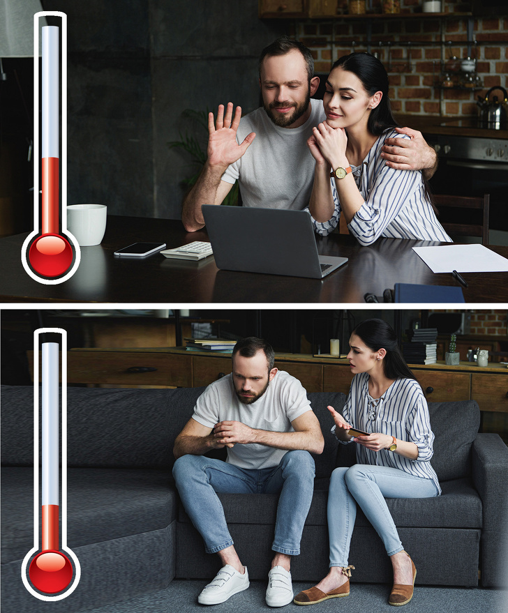 - Температура в будинку може зіпсувати відносини подружжя. Справа в тому, що чоловікам комфортніше жити в прохолоді, а от жінки часто мерзнуть і тому прагнуть зробити температуру в приміщенні максимально високою. Половина пар (55 %) регулярно сперечаються за температурного режиму. Вчені виявили оптимальний показник — 22 °С.
