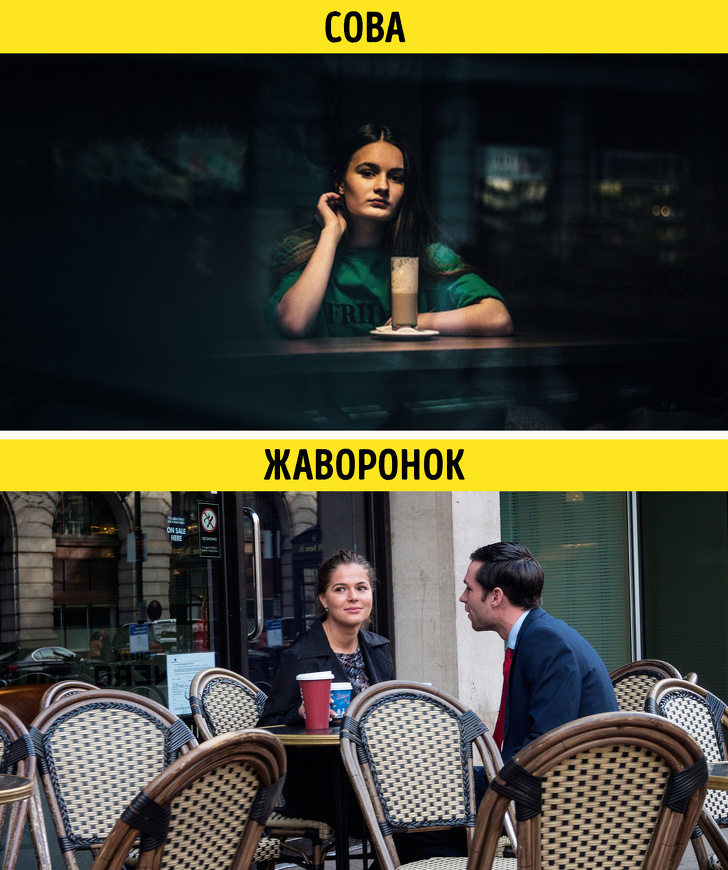 - У сов менше шансів знайти свою любов, ніж у жайворонків. Вчені з Університету Чикаго пояснили таку закономірність тим, що сови частіше знайомляться в нічний час (в барах і клубах) і, як правило, такий флірт не призводить до довгим і міцним відносинам. А ось жайворонки, навпаки, воліють побачення в більш світлий час доби, наприклад за чашкою кави в ресторанчику за рогом.