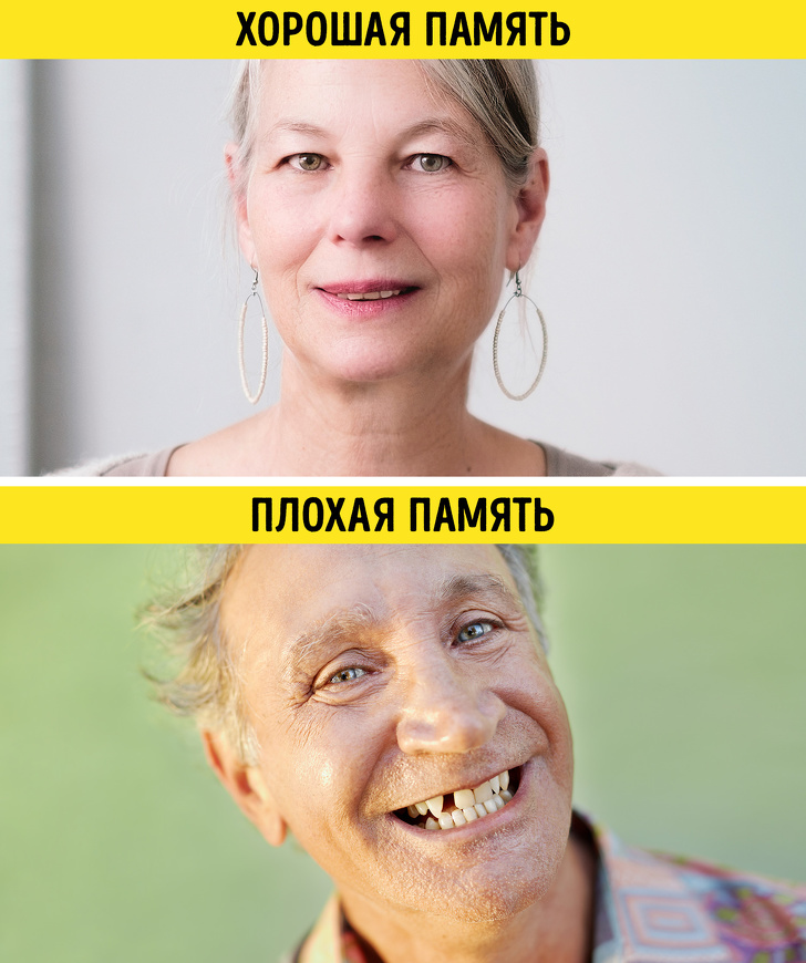 - Кількість зубів впливає на якість нашої пам'яті. Експеримент, в якому взяли участь 300 літніх респондентів, показав, що чим менше в людини зубів, тим важче йому запам'ятати інформацію. Такий результат можна пояснити тим, що при випаданні зуба руйнуються нейронні зв'язки і робота області головного мозку, що відповідає за запам'ятовування, слабшає.