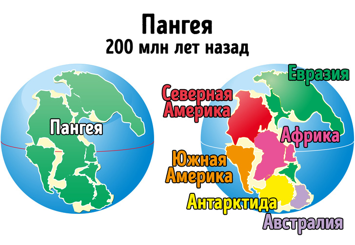 Приблизно 300 млн років тому практично вся суша Землі була об'єднана в єдиний суперконтинент — панею, який. В юрський період Пангея розкололася на два континенти, кожен з яких також згодом розділився. Так, з північного континенту, Лавразії, утворилися Північна Америка і Євразія, а з південного континенту, Гондвани, утворилися Індія, Австралія, Південна Америка, Африка і Антарктика. На думку вчених, через 250 млн років всі континенти знову об'єднаються в суперконтинент — Нову панею, який.