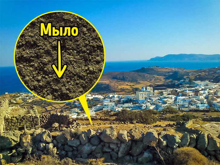 Гористий грецький острів Кимолос площею 37 кв. км має одну цікаву особливість. Коли йде дощ, острів покривається мильною піною. Справа в тому, що грунт Кимолоса складається з жирної мильною глини — такого природного мила, яке місцеві жителі використовують за прямим призначенням.