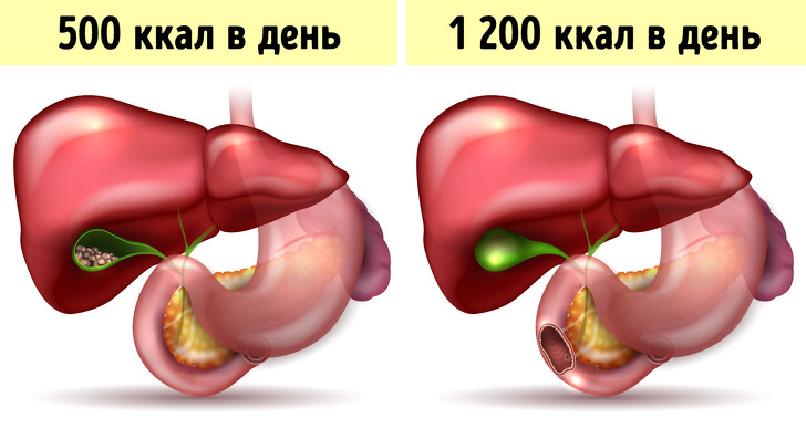 Шведські дослідники оцінили ризик виникнення жовчних каменів у людей, в день споживають 800 ккал і менше. Одна група дотримувалася суворої дієти протягом 3 місяців, а інша вживала 1 200-1 500 ккал протягом 9 місяців. Виявилося, що ризик виникнення жовчних каменів, розрахований з урахуванням різниці часу дієт, був у 3 рази вище в першій групі, ніж у другій.