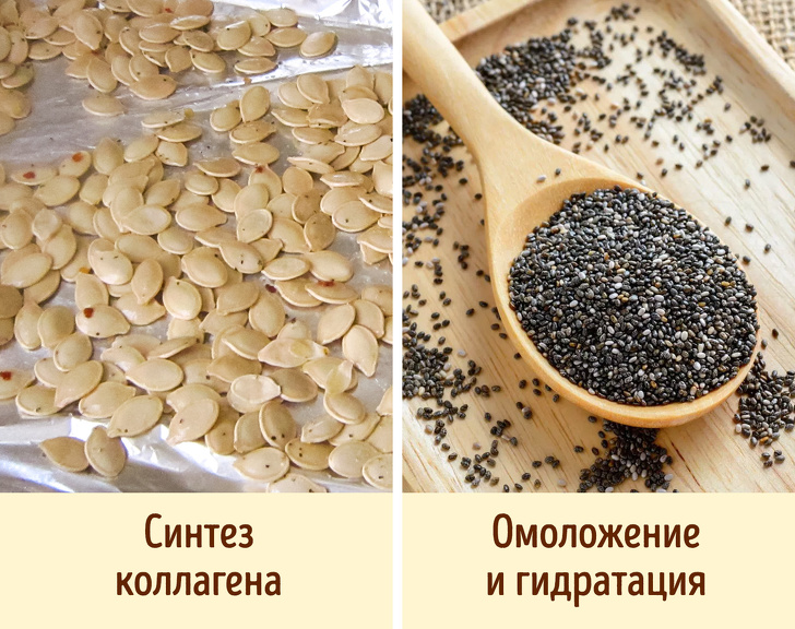 - Гарбузове насіння — це рослинний джерело, багатий цинком, який стимулює синтез колагену. Продукти, що містять цинк, також уповільнюють швидкість розпаду білка. Крім того, цинк допомагає прискорювати процес загоєння ран, що необхідно для здорової шкіри. Для їжі краще вибирати обсмажені насіння — в них більше корисних речовин. Рекомендується 2 ст. л. додавати в салати або домашню гранолу.