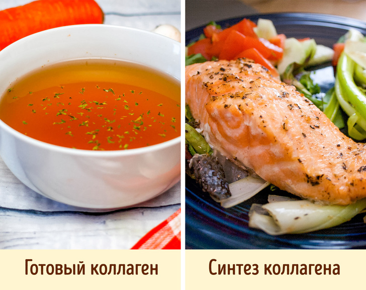 - Кістковий бульйон, мабуть, один з кращих варіантів, бо як інші продукти тільки стимулюють вироблення колагену, а цей бульйон містить биоактивную форму білка, яку організм може почати використовувати відразу ж. Яловичий бульйон багатий колаген I типу, який позитивно позначається на здоров'ї шкіри; бульйон з індички і курки містить колаген ІІ типу, який підтримує нормальне функціонування суглобів. Кістковий бульйон для здоров'я шкіри в ідеалі потрібно пити щодня порціями по 170-340 р.