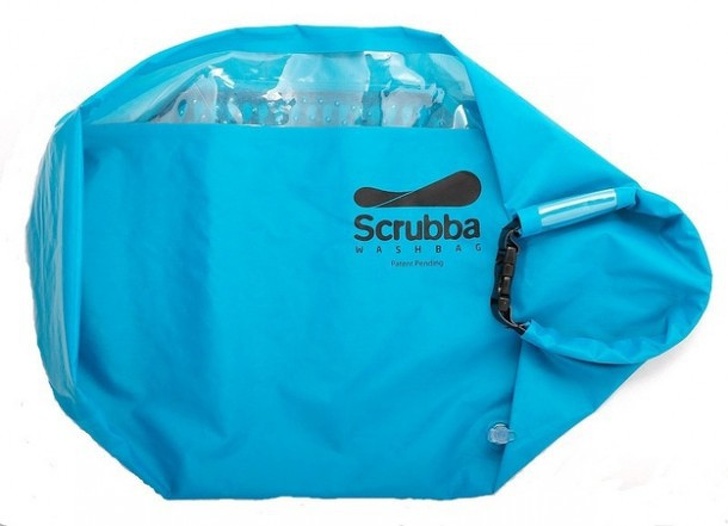 Scrubba Wash Bag — це портативна пральна машинка. Вона просто незамінна під час подорожей. Всередині сумки є спеціальні пухирчики, які допомагають відіпрати одяг. Потрібно покласти в сумку речі, налити води і додати пральний порошок. Далі сумка герметично закривається, після чого її потрібно добре «втерти».