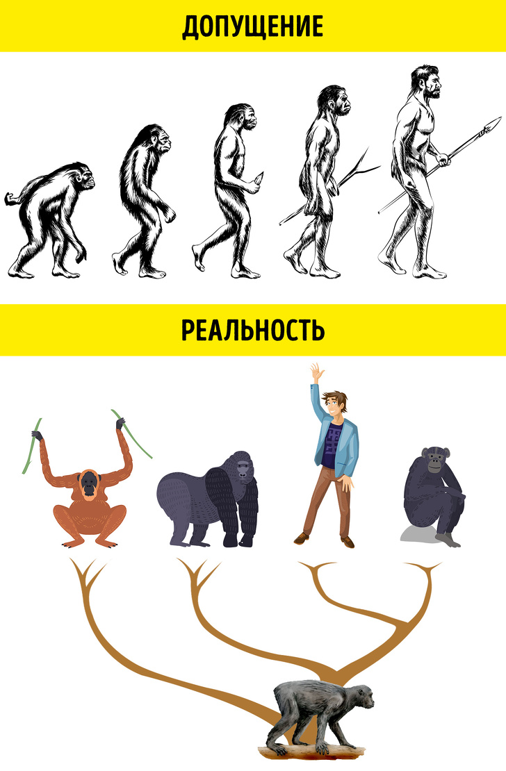 І, нарешті, знаменитий малюнок Рудольфа Золинджера «Марш прогресу» (1965), умовно відображає еволюцію людини. При погляді на цю ілюстрацію створюється враження, що еволюція — спрямований процес перетворення мавпи в людину. Насправді людина не може вважатися нащадком мавпи: ми просто мали спільного предка, який жив 18 млн років тому, але потім еволюційні шляхи горили, шимпанзе, орангутана і людини розійшлися.
