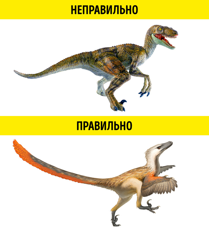 Те, що хижий двоногий динозавр велоцираптор був покритий пір'ям, теж стало відомо нещодавно. При докладному вивченні його кісток антропологи виявили горбки, за структурою нагадують освіти на кістках сучасних птахів. Так що всі зображення доісторичного ящера на звичних картинках не відповідають дійсності: велоцираптор міг похвалитися пишним оперенням.