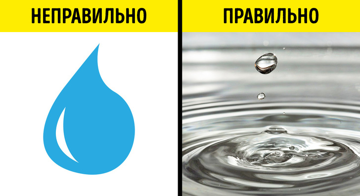 Ще одне знайоме всім зображення, яке не відображає дійсності. Крапля води насправді має сферичну форму, вона швидше кулька, ніж сльозинка. А сльозинка — це таке ж умовне зображення, як сердечко, не має нічого спільного з виглядом справжнього серця.