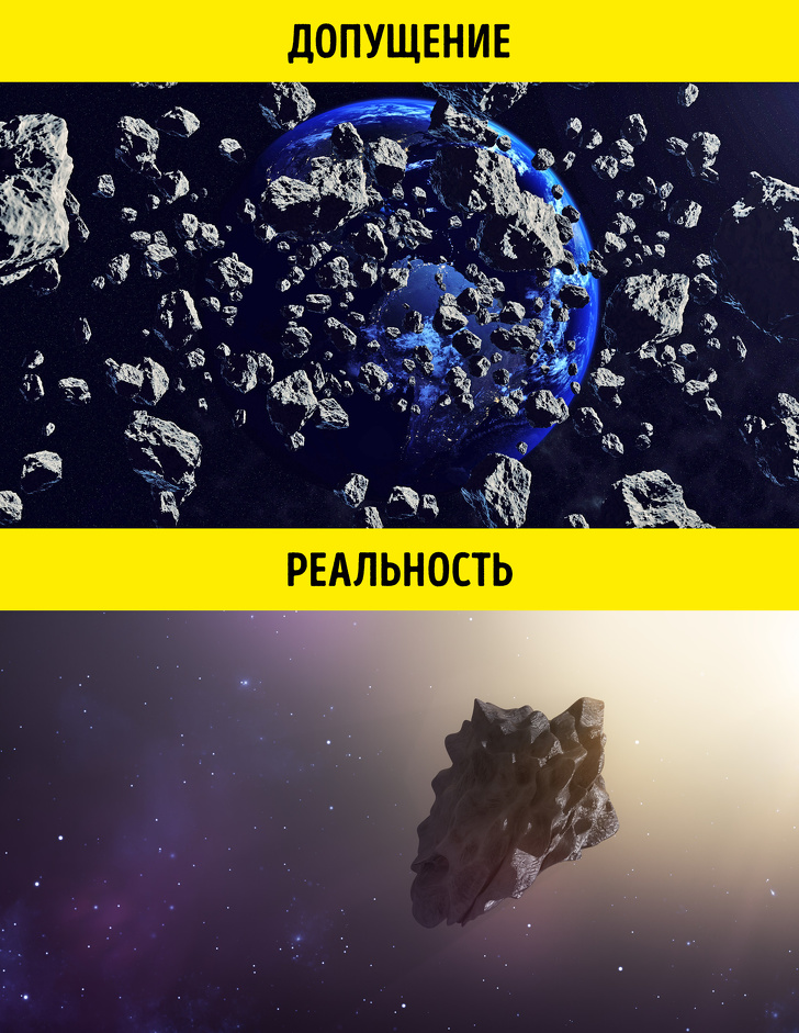 Та ж проблема космічних відстаней не дає зобразити і пояс астероїдів. Насправді космічного корабля, що потрапив у цей пояс, не варто боятися, що космічні булижники його расплющат. Середня відстань між астероїдами — кілька мільйонів кілометрів.