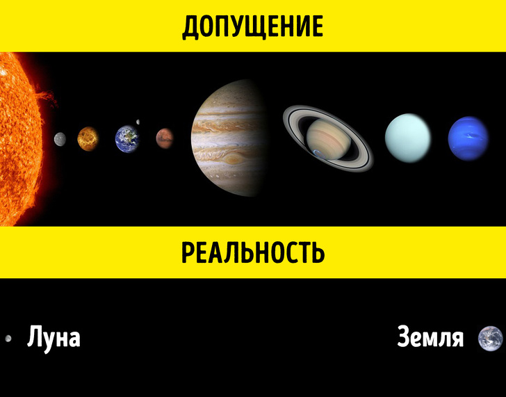 Достовірно передати відстані складно навіть в контексті земних об'єктів, тому не варто вважати, що схема Сонячної системи відображає всі масштаби правдиво. Космічні відстані навіть уявити складно, не те що зобразити. Планети Сонячної системи розташовані один від одного дуже далеко. А схема, де вони стали в рівний ряд, показує лише їх умовне розташування. Відстань між Землею і Місяцем — близько 400 тис. км, що з деякими застереженнями можна зобразити так, як на картинці вище.