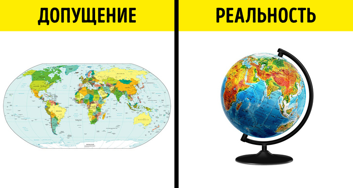 Ще одне припущення, з яким ми повинні миритися, — це карти світу. Передача тривимірного об'єкта, яким є планета Земля, за допомогою плоского зображення неможлива. Будь-яка карта світу, країни або місцевості — це всього лише проекція. Найвідоміша проекція, яка стала нам рідною на уроках географії, — проекція карти світу Герарда Меркатора. Тим, хто не готовий змиритися, що Гренландія гігантська, Австралія маленька, Тихий і Атлантичний океани одного розміру, а полюси тягнуться до нескінченності, варто користуватися глобусом.