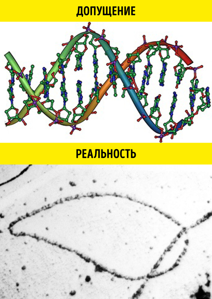 А ось молекули ДНК навмисно малюють не так, як вони виглядають насправді. Мета картинки зі шкільного підручника біології не показати молекулу ДНК, а дати уявлення про основні принципи роботи на прикладі її моделі. Насправді ДНК виглядає не настільки барвисто.