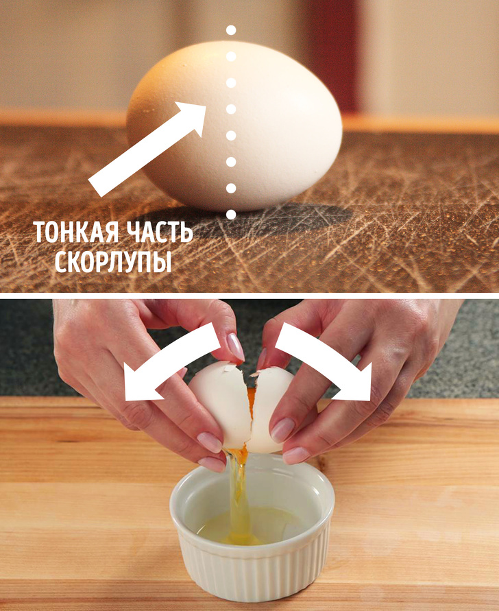 Якщо неправильно розбити яйце, то шкаралупа буде застрягати в яєчної мембрані і падати в миску. Секрет в наступному: коли ви розбиваєте яйце, ударяйте про найширшу частину шкаралупи (близько центру), а потім великими пальцями розтягуйте шкаралупу в сторони.