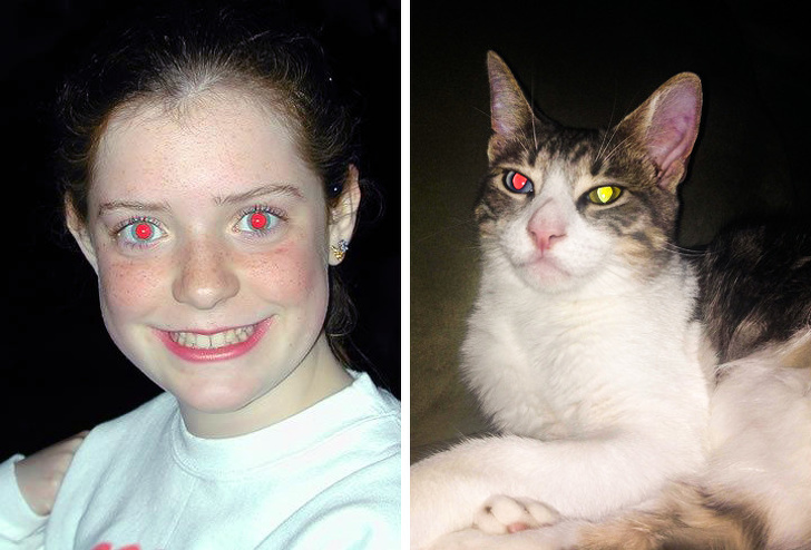 У момент спалаху зіниця не завжди встигає звузитися, і світло від спалаху відбивається від сітківки ока, яка покрита кровоносними судинами. У підсумку отримуємо червоні очі на фото.