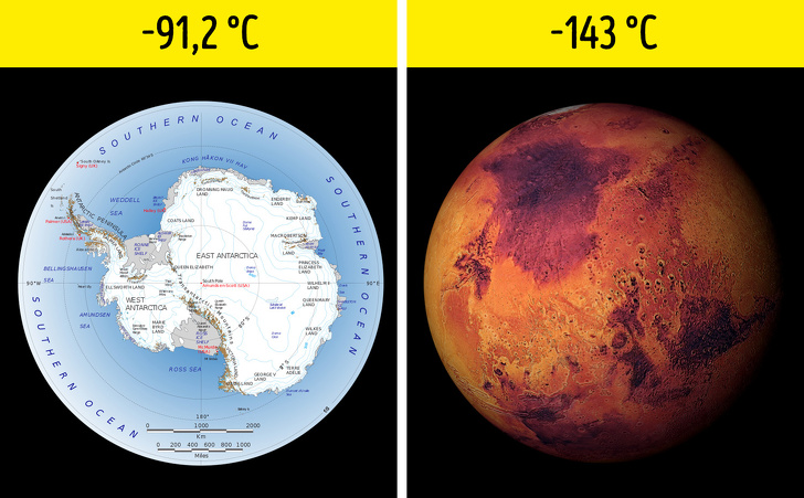 Середня температура на Марсі становить -63 °С, а через розріджену атмосферу добові коливання температури можуть бути значними. При найбільш сприятливих умовах повітря може прогріватися вдень до 20 °С, але зимової ночі холод може досягати -125 °С навіть на екваторі, а на полюсах температура може падати і до -143 °С. Таким чином, Червона планета — куди більш суворе й холодне місце, ніж Антарктида.
